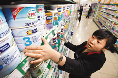 ■20日寧夏銀川某大型商場內,工作人員在擺放幼兒配方奶粉。 資料圖片
