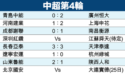 香港文匯報訊 (記者 陳曉莉) 中國足協超級聯賽(中超)24日繼續第四輪賽事。長春亞泰在領先兩球的情況下被主將李瑋峰傷停無法出場的天津泰達扳成3:3平。