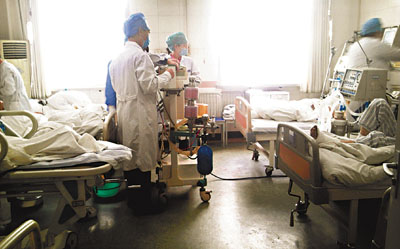 ■北京右安門醫院的醫護人員在病房治療傷者。 新華社