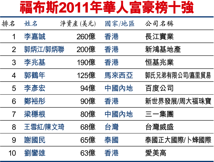 福布斯2011年華人富豪榜十強