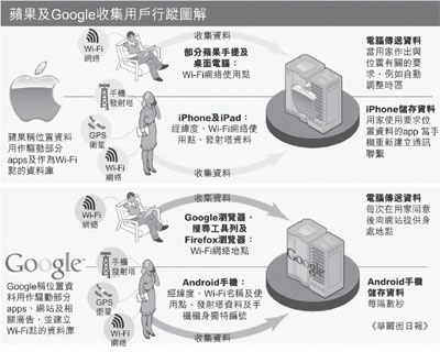 繼iPhone及Android手機涉嫌追蹤用家位置後,蘋果公司及Google再被揭發透過連接Wi-Fi的電腦收集用戶資料。美國國會議員已要求兩巨企的代表下月出席私隱聽證會,蘋果行政總裁喬布斯則否認監察客戶。