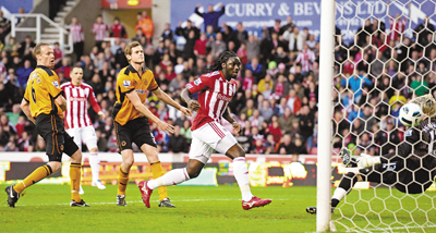 史篤城昨晨在英超聯主場以3:0完勝狼隊,躍升至積分榜前十;後者則排名聯賽倒數第二,深陷降級區難以脫身。圖為鍾斯16分鐘接賓納妙傳頭球破門為主隊首開紀錄。 ■綜合外電消息