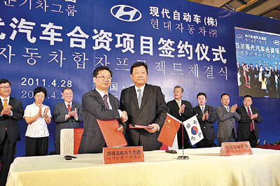 香港文匯報訊(記者 黃冬、宋濤、張磊 成都報道)四川南駿汽車集團與世界500強企業韓國現代自動車株式會社昨日簽署了合資經營合同,標誌著韓國現代汽車正式入駐四川。這是韓國現代汽車繼2002年設立北京現代汽車合資公司、東風瑞達起亞合資公司之後,在內地建設的第三家汽車生產基地。四川省委副書記李崇禧,副省長黃小祥,韓國駐中國大使柳佑益,駐成都總領事鄭萬勇,韓國現代自動車株式會社會長鄭夢九及其代表團,國家商務部信息化司司長李晉奇,資陽市委書記李佳等省內高層和嘉賓及相關部門人士出席了簽約儀式。