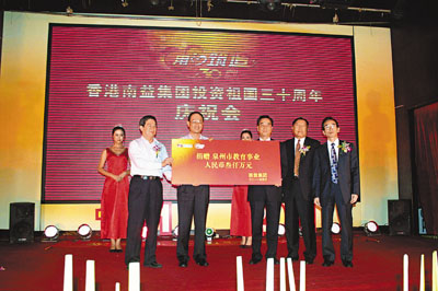 作為民政部「最具愛心外資企業」,30年間,南益集團急公尚義,扶貧濟困,合計捐資已逾3億元,其回報社會、熱心公益的善舉不斷贏得各界好評。單在教育領域,南益集團就斥資2億多元,捐助各級學校150多所,所捐助的中小學大多在貧困山區。此外,南益還參與發起成立泉州香港慈善促進總會,不間斷向泉州各縣市慈善總會捐款。