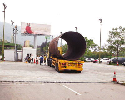 香港文匯報訊(記者 蔣焯文)一輛載著長36呎,直徑12呎,重達30噸巨型鋼管的貨櫃拖車,昨早11時許沿北大嶼山公路駛往東涌方向,至映灣園對開東涌東交匯處彎位時,黃姓、55歲司機報稱為閃避切線車輛致失控,車身向左翻側,拖架上的巨型鋼管滾跌落馬路,路邊一列防撞欄和一支燈柱被鋼管撞毀,幸當時沒有其它車輛駛經被撞及。意外中黃姓司機頭部受傷,獲送瑪嘉烈醫院治療後無礙出院。肇事拖車及鋼管一度封阻堵塞交通,待安排其他拖架將鋼管吊走,交通始恢復正常。香港文匯報記者蔣焯文 攝