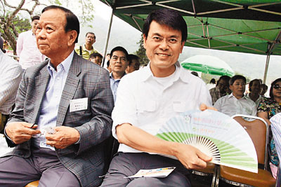 ■邱騰華(右)、劉皇發昨日出席「環保鄉村運動」嘉年華,分享運動推行成果。香港文匯報記者梁祖彝 攝