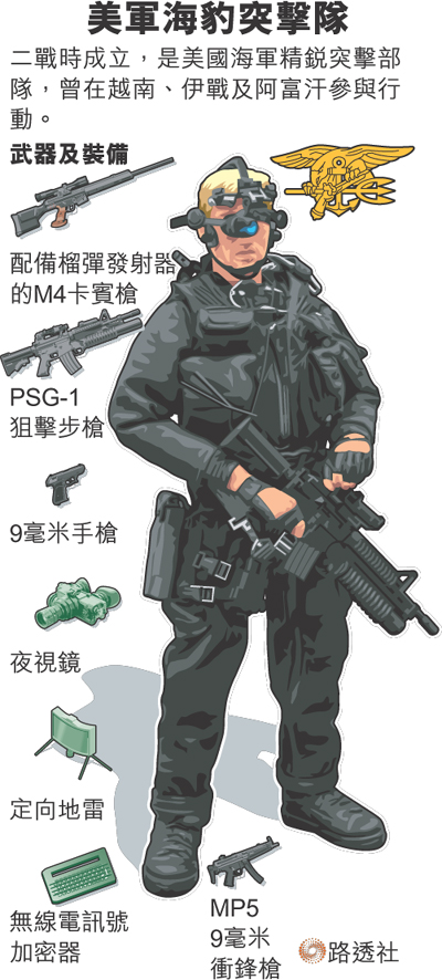 在突擊行動中立下大功的海豹突擊隊,是美國海軍的精銳部隊。過往在越戰、波斯灣戰爭以至近年狙擊索馬里海盜,都曾經大顯身手。