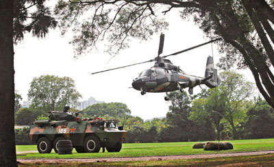 ■駐軍新圍軍營開放日,駐軍出動直升機和裝甲車參與演練。香港文匯報記者曾慶威 攝