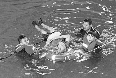 ■3名消防員合力救起在北角墮海的男子。