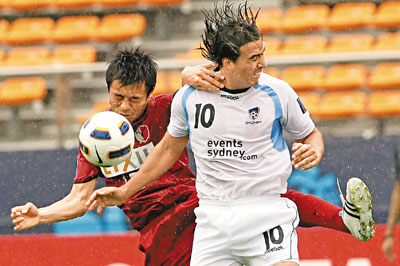 ■昨日亞冠盃H組末輪角逐,日本鹿島鹿角在東京以2:1反勝澳洲FC悉尼(白衣),但得失球差卻不及作客贏中超上海申花3:0的韓國水原藍翼,次名出線。美聯社