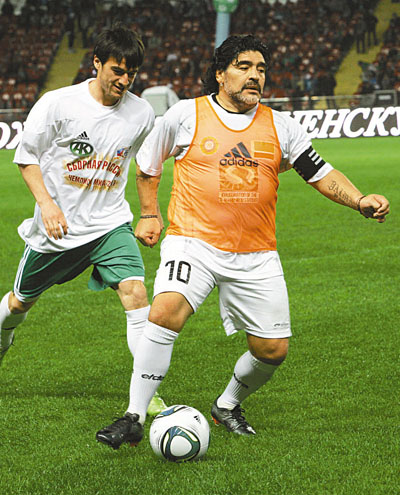 ■包括森莫蘭奴、艾耶拉等前名將獲邀出席俄羅斯格羅茲尼一場表演賽,其中年過50的阿根廷「球王」馬拉當拿(右)大騷球技。 美聯社