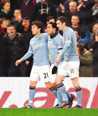 ■大衛施華、泰維斯與阿當莊臣(左至右)誓助曼城捧盃。 美聯社