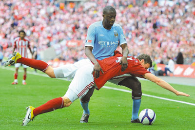 ■耶耶托尼(上)獨力助曼城挫史篤城捧足總盃。法新社