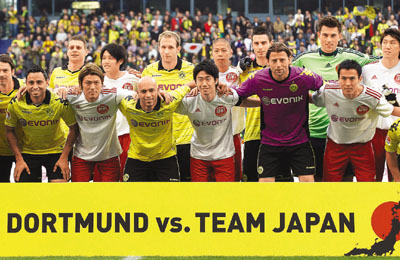 ■德甲出爐冠軍多蒙特(黃衣)與包括香川真司等等一眾日本球員合演了一場慈善賽,為日本受地震與海嘯影響的災民籌款。 路透社