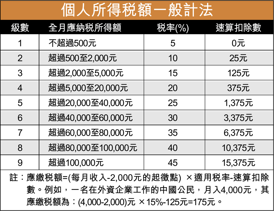 註:應繳稅額=(每月收入-2,000元的起徵點) ×適用稅率-速算扣除數。例如,一名在外資企業工作的中國公民,月入4,000元,其應繳稅額為:(4,000-2,000)元 ×15%-125元=175元。