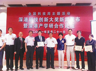 ■「首屆深港科技創新大獎最佳信息科技獎」獲獎港企代表與主辦方合影。香港文匯報記者郭若溪 攝