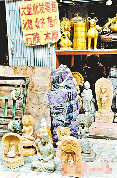 據了解,贗品從生產到流通環節,存在巨大的灰色鏈條。在一家經營古玩的小店,門口竟然公開寫著:「北魏唐代石像大量批發」。經詢問,便宜的數千元,最貴的也不過三四萬元。黃伯提醒說:「不懂就不要買,真貨是不會擺出來賣的。」