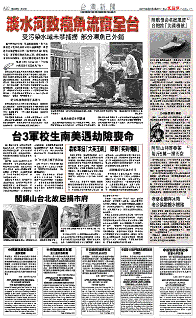 據中通社23日電 台灣媒體揭發,有不法漁民從水質污染的淡水河中捕撈漁獲,再透過台北漁產運銷公司(魚類中央市場)配送全島,甚至轉銷到食品加工商;傳媒抽檢來自淡水河的鮮魚,送往化驗後竟發現含有致癌物「砷」(Arsenic),不知情的民眾恐早將毒魚吃下肚。
