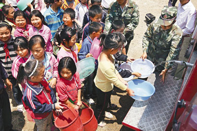 ■ 26日,湖北隨州消防支隊官兵為學生送水。 新華社