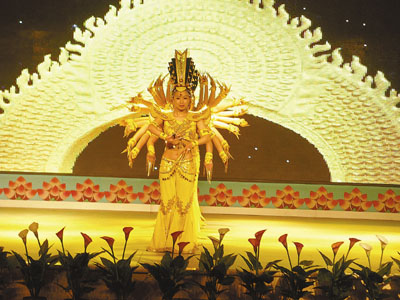 然而,去到敦煌不欣賞敦煌歌舞是憾事,敦煌賓館特別在酒店內設計敦煌歌舞宴滿足一下行程緊迫的旅客,客人坐在廣闊的演藝廳大堂,一邊享美食,一邊欣賞面前一班美女在輕歌曼舞,各類舞蹈是取材於敦煌壁畫編排的,有《歡騰伎樂》、《鼓與琵琶》、《千手觀音》、《絲路駝鈐》等。在看完近一小時的西部歌舞節目表演後,美女最後還落台向你敬酒!你花上幾百元就做「皇帝」了,應不會「肉痛」;如果你是志在欣賞歌舞,美食不重要,花一百八十元就可以純欣賞歌舞了。