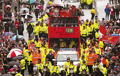 ■雖然失落歐聯錦標,但曼聯昨日拎英超錦標,舉行勝利巡遊,答謝支持者一直擁戴。 ■美聯社