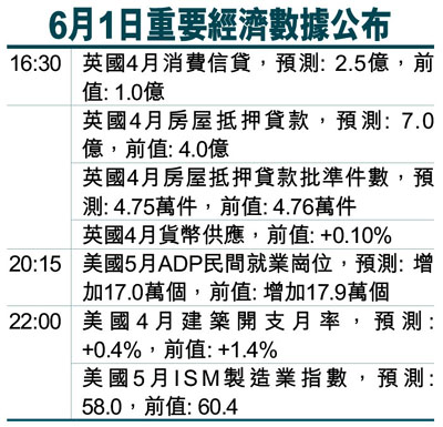 周二日本厚生勞動省公布最新就業數據,4月份失業率報4.7%,比上月輕微上升0.1%,數據與預期一致;個人收入方面按年下降1.4%,已連續二個月出現下降;周期加班工資按年減少3.4%,為2009年12月以來首次下降,數字下降可能受311地震和海嘯後影響工廠活動和供應鏈所至。此外,日本Markit5月份製造業採購經理指數由4月份的35.0水平大幅上升至51.3,為2001年10月以來最大升幅,該數據更是過去三個月以來首次回升至50中位數上方。數據得以改善最大原因是經過311地震和海嘯造成的破壞後,工業生產線有望重新啟動所刺激所致;至於4月份工業生產報升1%,而3月工業生產為下跌15.3%,是有史以來最大降幅,但數據仍遠遜預期的上升2.8%;在家庭消費開支方面,4月份家庭消費開支較上年同期下跌3.0%,預測下跌2.9%,數據較3月時下跌8.5%已有所放緩,表明消費者信心受3月地震的衝擊影響已經開始減弱。
