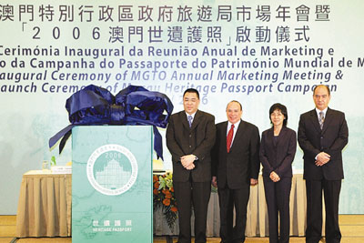 ■安棟樑(左二)與澳門行政長官崔世安(左一)出席「澳門世遺護照」啟動儀式