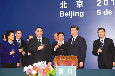 ■澳門與廣東省在北京簽署《粵澳合作框架協議》,加強區域合作發展,國家副主席習近平(右二)與澳門行政長官崔世安(左三)出席簽署儀式。