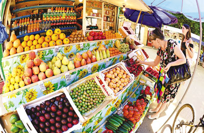 ■俄羅斯全面禁止歐盟蔬菜入口。圖為莫斯科街市銷售蔬菜及水果。 法新社