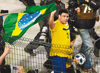 綜合新華社消息 正為今夏美洲盃備戰的巴西國家足球隊,於當地時間7日晚在聖保羅與羅馬尼亞合演了一場熱身賽,結果巴西小勝1:0。比賽中,巴西球星朗拿度後備上陣,以最後一場比賽告別為之奮鬥十多年的「森巴兵團」。