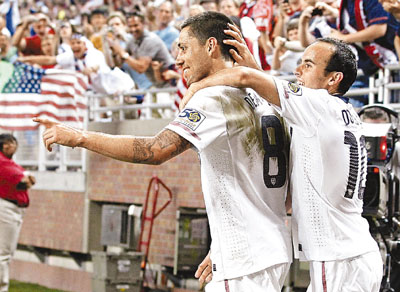 ■昨晨美洲金盃足球賽C組首輪,主隊美國憑艾迪杜尼與丹普西(左)建功,贏加拿大2:0,延續他們金盃分組賽史上的不敗身。 法新社