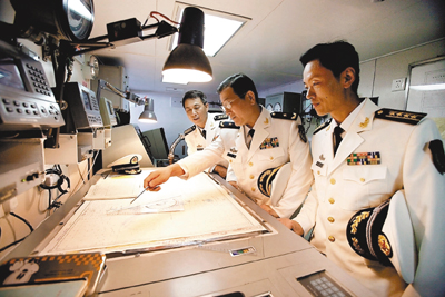 ■海軍某部遠航訓練中,指揮員制定航海路線。