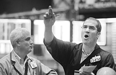 ■預計100美元成為油價「新底線」。圖為紐約原油期貨市場,交易員在議價。法新社