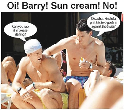 傑斯性醜聞讓英足壇為之震撼;不過,曼徹斯特市的另一頭,可能還會有更令人驚訝的事情發生。據《世界新聞報》披露,相約一起度假的巴里,竟然公開在泳池旁邊給曼城和英格蘭雙重隊友赫特擦防曬油(見圖)。一個目擊者說:「他們像一對老夫妻。」《世界新聞報》還給這兩位曼城球星加上了對白,赫特說:「親愛的,你能不能幫我擦防曬油?」巴里說:「好的……不過,在對瑞士時你失的那2球,究竟是怎麼一回事?」