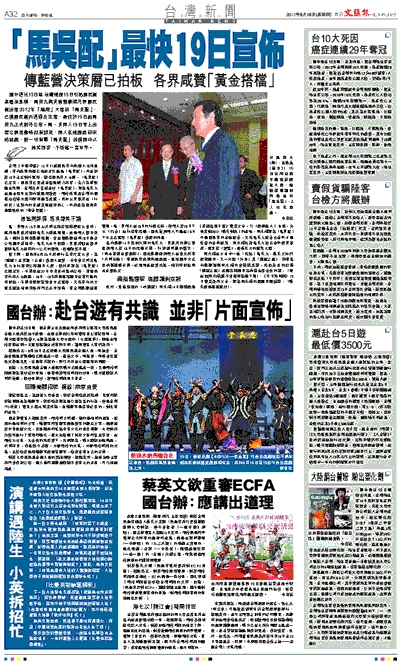 台灣《中國時報》15日引述國民黨內高層人士消息稱,黨內決策高層已拍板定案通過「馬吳配」,料最快於19日正式對外宣布。該名國民黨人士稱,「馬吳配」已定案,國民黨已完成首階段戰力部署,全力為爭取連任衝刺。台灣各界普遍看好「馬吳配」,認為馬英九在過去四年任期內就經濟復甦、兩岸政策及台灣的國際地位等方面均取得顯著成就,再加上吳敦義在「行政院」任期內的卓越表現頗得民心,料將成為國民黨延續執政的「黃金搭檔」。