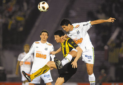 ■昨晨南美自由盃決賽首回合,烏拉圭球會彭拿路(黃黑衣)主場與巴西山度士踢成0:0。 美聯社