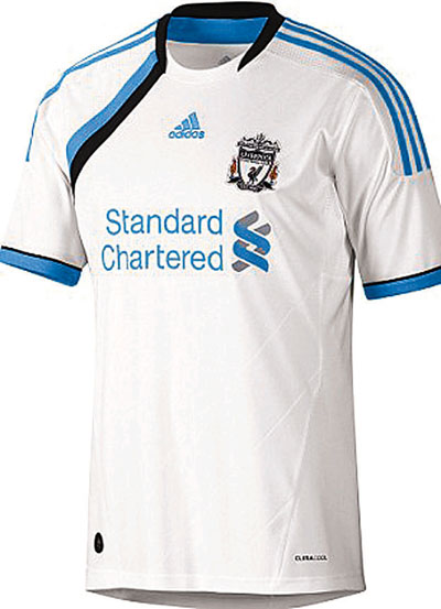 ■英超利物浦來季新作客球衣,袖邊與斜間竟用上代表同市死敵愛華頓的藍色。 網上圖片