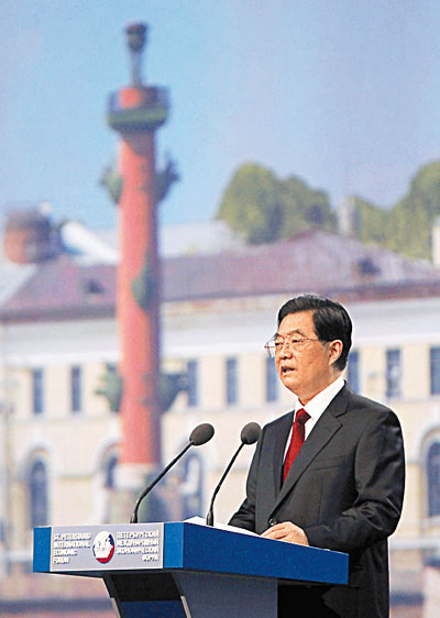 ■胡錦濤出席聖彼得堡國際經濟論壇並發表演講。路透社