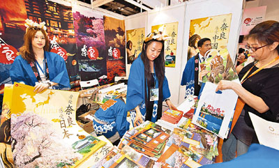 ■「2011北京國際旅遊博覽會」昨日開幕。圖為日本奈良縣參展團向觀眾發放宣傳品。新華社