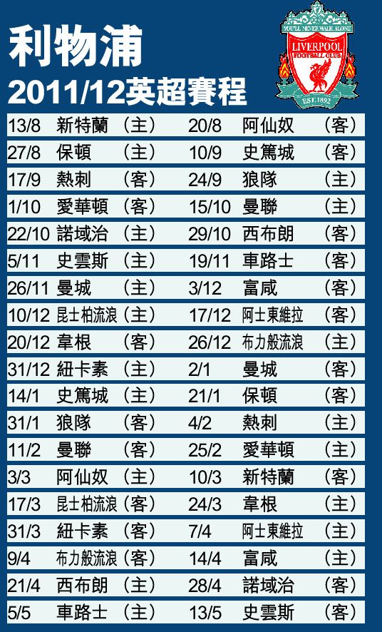 利物浦2011/12英超賽程 (2011-06-18) (圖)