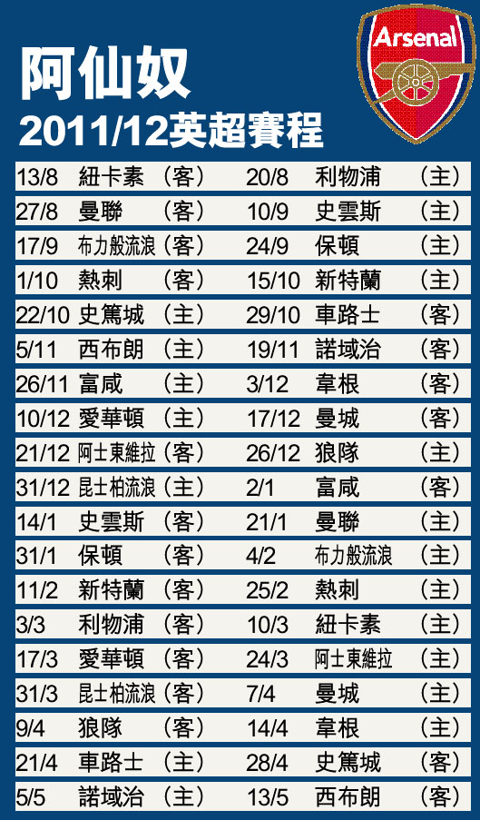 阿仙奴2011/12英超賽程