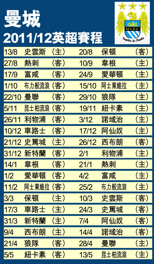 曼城2011/12英超賽程 (2011-06-18) (圖)