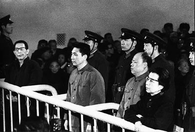 ■右起:「四人幫」成員江青、姚文元、王洪文、張春橋1981年出庭受審的情景。