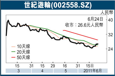 三峽遊,尤其是豪華遊市場目前呈現供不應求的態勢,而世紀遊輪(002558.SZ)處於行業領先地位,具有較強的定價能力,且未來票價仍有上調空間。另外,「世紀寶石」號2010年9月投入運營,2011年將全年投入運營,而2012年和2013年公司也將分別有新船下水運營,公司接待能力將持續提升。預計公司2011年和2012年每股收益分別為0.85元和1.10元(人民幣,下同),按6月21日收盤價25.27元計算,對應的PE分別為30倍和23倍,維持「增持」的投資評級。