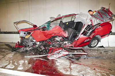 ■的士疑司機打瞌睡,在大欖隧道內迎面狂撼旅巴後嚴重損毀,有如廢鐵。