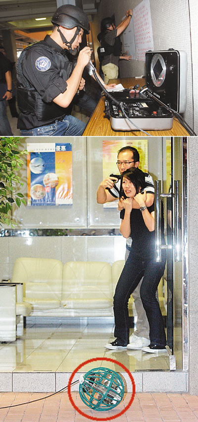 (上圖)警察談判組昨示範「遙距」游說持搶劫匪挾持人質時的情況,談判員透過通話器與劫匪對話。(下圖)「談判球」(紅圈)內有鏡頭、收音器及喇叭,方便談判員與劫匪對話。香港文匯報記者劉國權 攝