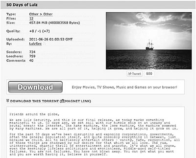 LulzSec透過檔案互換網站Pirate Bay發出訊息稱:「過去50天,我們已干擾及揭露多個政府、大企業的資料。現在是時候說再見,留下如我們所願的鼓舞、恐懼、否定、快樂、認同、不認同、嘲笑、尷尬、反思、嫉妒、憎恨、甚至是愛。」(見圖) LulzSec強調,這些行動是為了自娛,他們已達到目的。