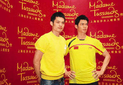 中國羽毛球「全滿貫」名將林丹27日來到上海杜莎夫人蠟像館,為自己的蠟像揭幕。新華社