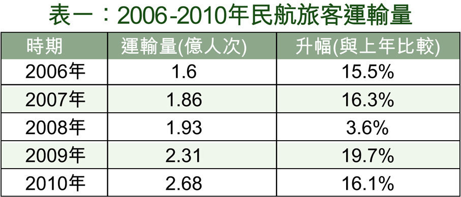 表一:2006-2010年民航旅客運輸量