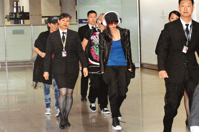 身穿藍衣緊身T恤、黑色皮外套的張柏芝在細佬張豪龍和經理人Emily的手拖手保護下步出閘,而在場的50多名機場保安如臨大敵,築起人牆隔開記者,而記者們亦一擁而上,更有記者跌鏡頭,場面十分混亂。刻意戴上CAP帽及耳筒的柏芝似是有意回避記者婚變問題,一行人被機場保安以360度人肉保護,記者難以行近,只好大叫發問:「有冇後悔同陳冠希機艙合照?」、「呢個係咪你婚變導火線?」、「霆鋒暗示離婚,你有乜反應?」、「係咪爭仔撫養權?」、「係咪仲有同霆鋒傳SMS?係咪仲相愛?」木無表情的柏芝對問題都扮聽唔到,沒有回答。擾攘一番後,大隊行到扶手電梯落地下,最後柏芝順利登上7人車,並拉上車簾,駛離機場。
